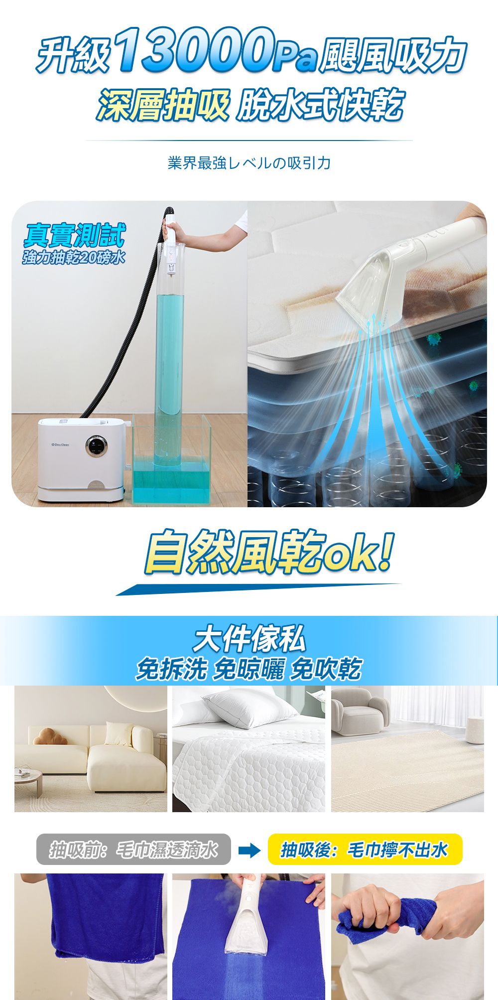 1.創新高溫融汙系統,熱水快速融汙,13Kpa大吸力吸污,效果立竿見影。