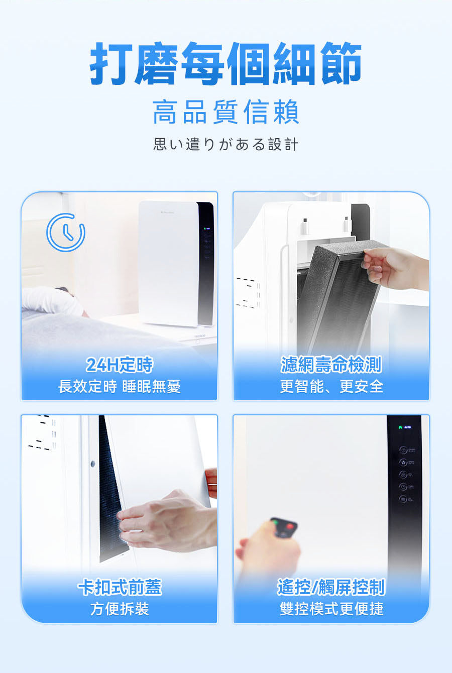 6. 貼心睡眠模式,自動息屏,運作相當於呼吸聲。濾網拆裝方便,易於清潔。