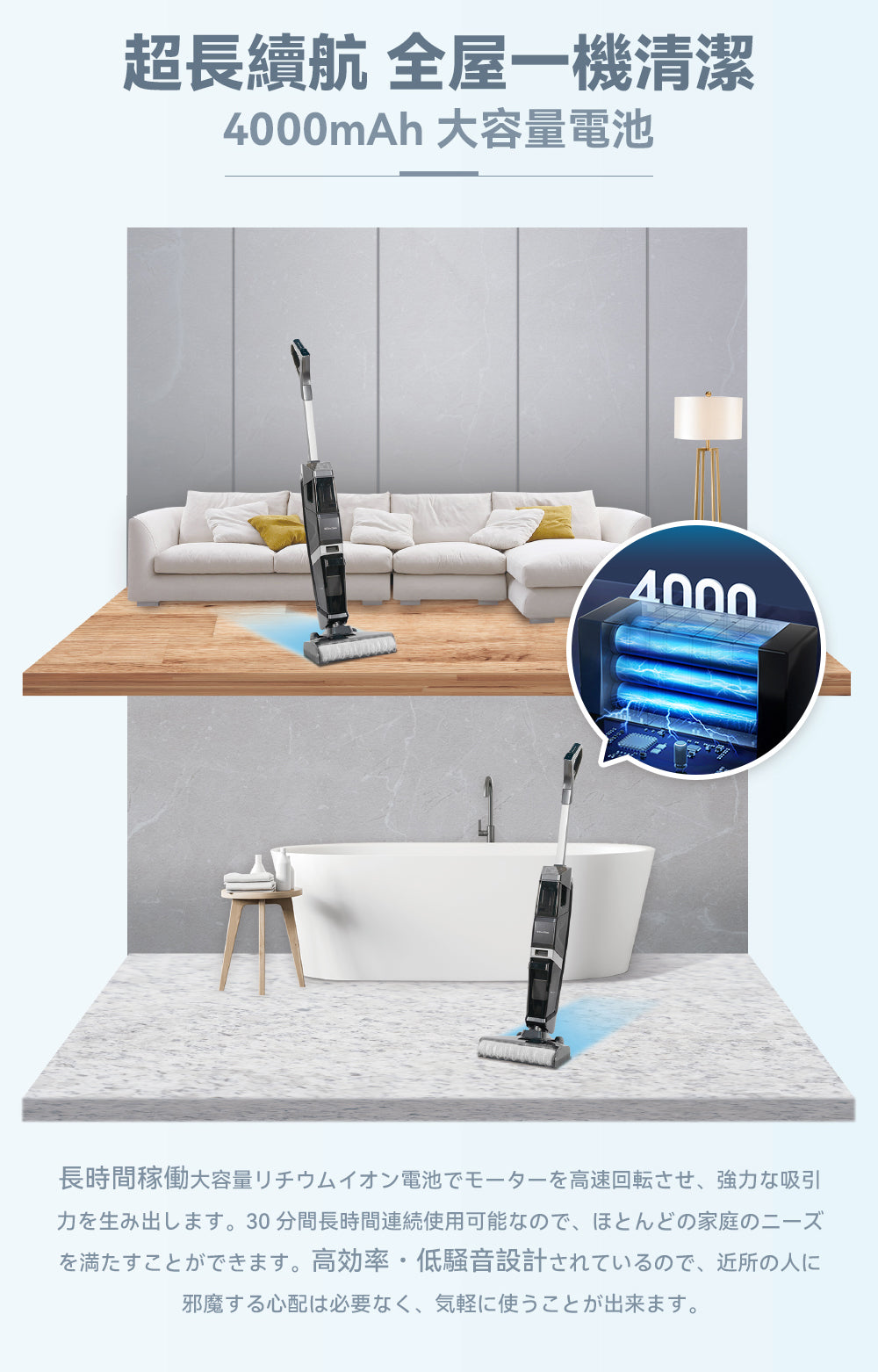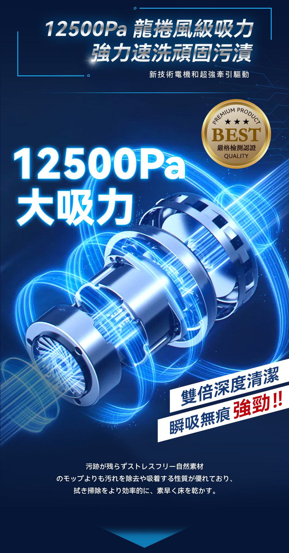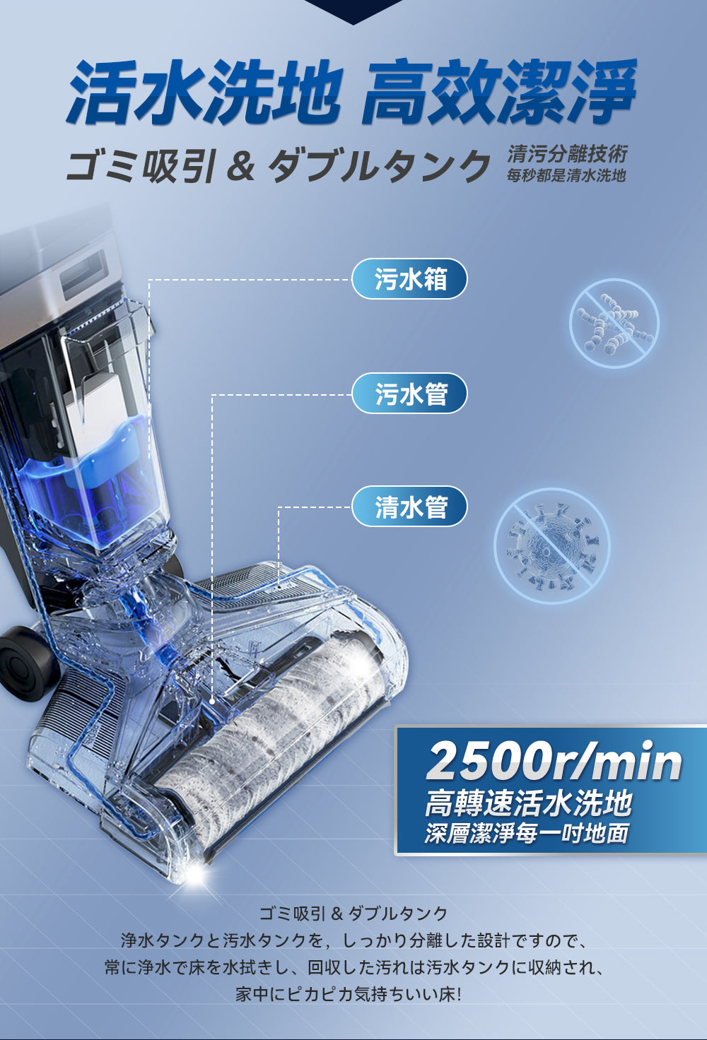4. 每分鐘擦地2500次,12500Pa超大吸力 ,洗掉頑固污跡。