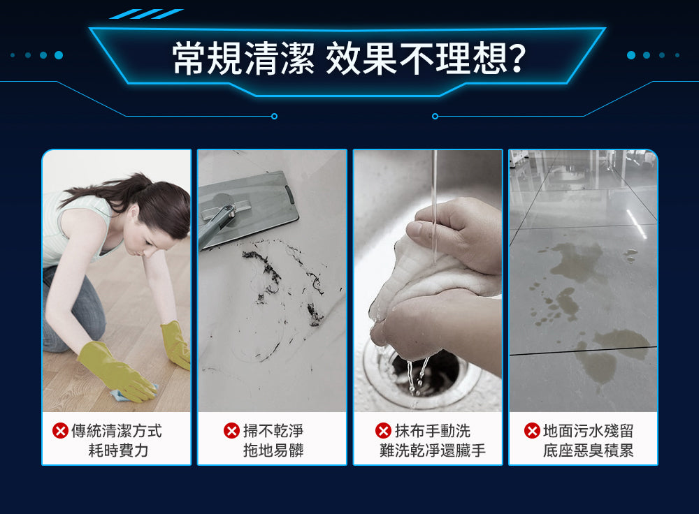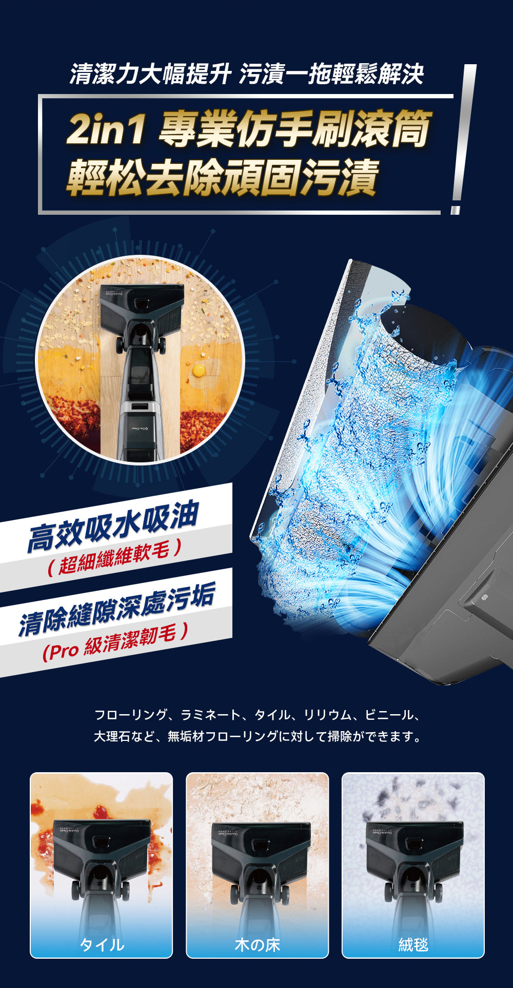 1. 吸拖洗一遍過,不留水漬不彎腰,一鍵自清潔。