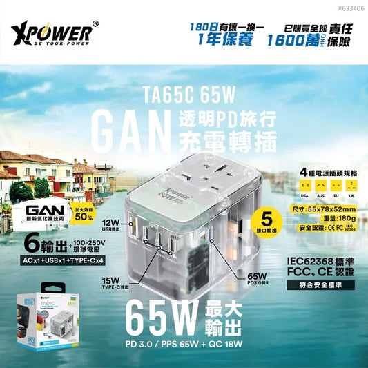 XPower TA65C 65W 5 Ports GaN PD 透明旅行轉插